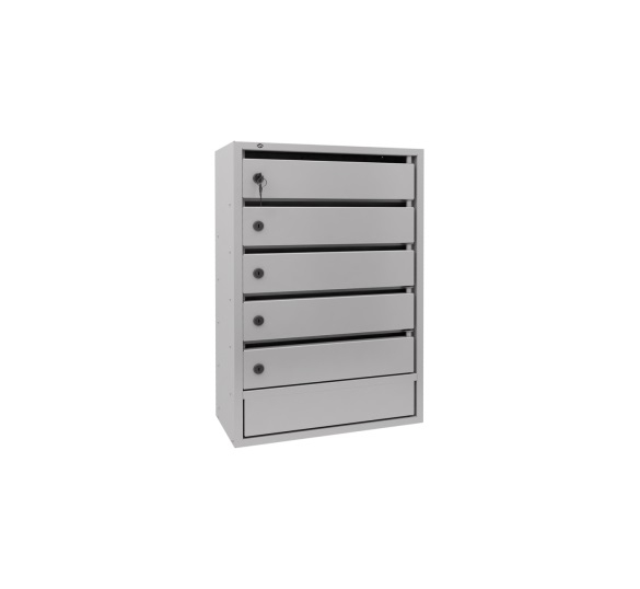5-и секционные почтовые ящики для подъездов многоквартирных домов серии «Орион М» с задней стенкой. Корреспонденция располагается в секции под углом 30 градусов.