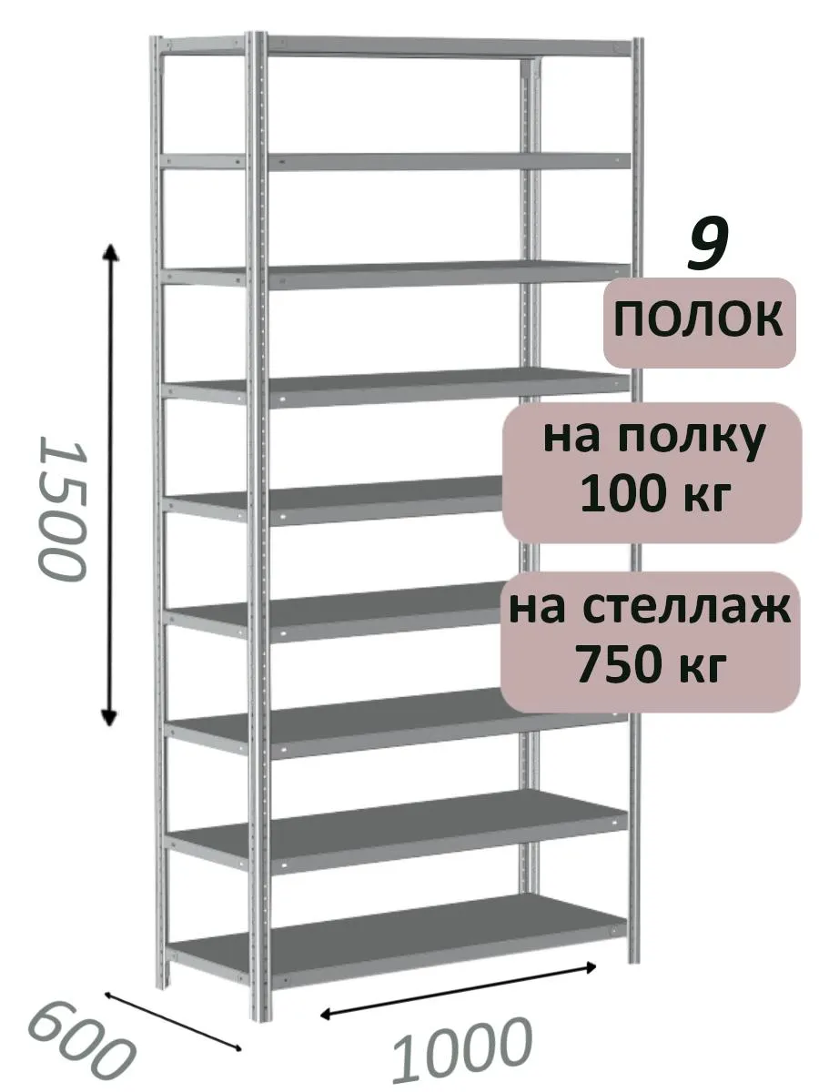 Стеллаж металлический полочный МС 1500х1000х600, 9 полок, 100 кг на полку, светло-серый