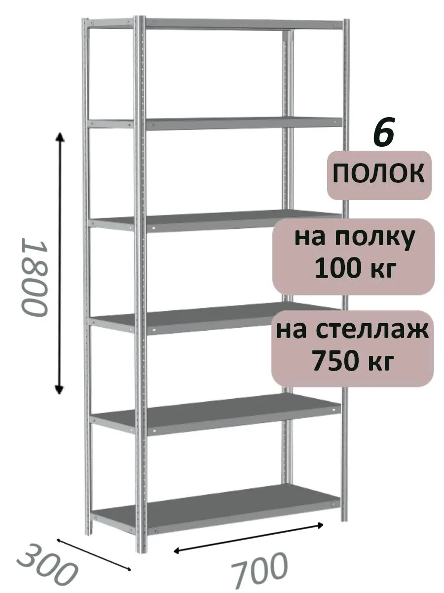 Стеллаж металлический полочный МС 1800х700х300, 6 полок, 100 кг на полку, светло-серый