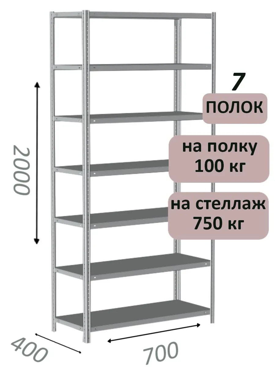Стеллаж металлический полочный МС 2000х700х400, 7 полок, 100 кг на полку, светло-серый