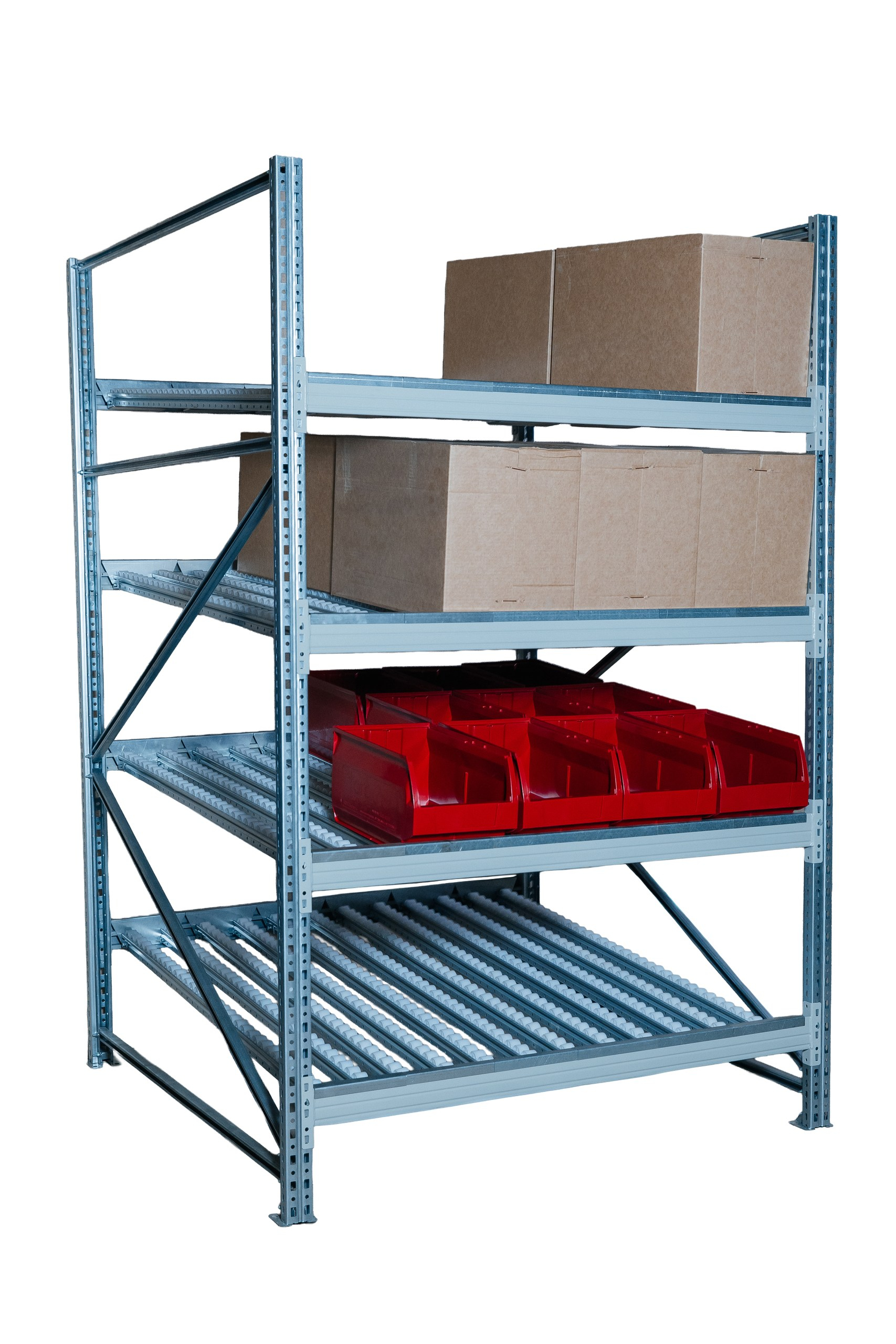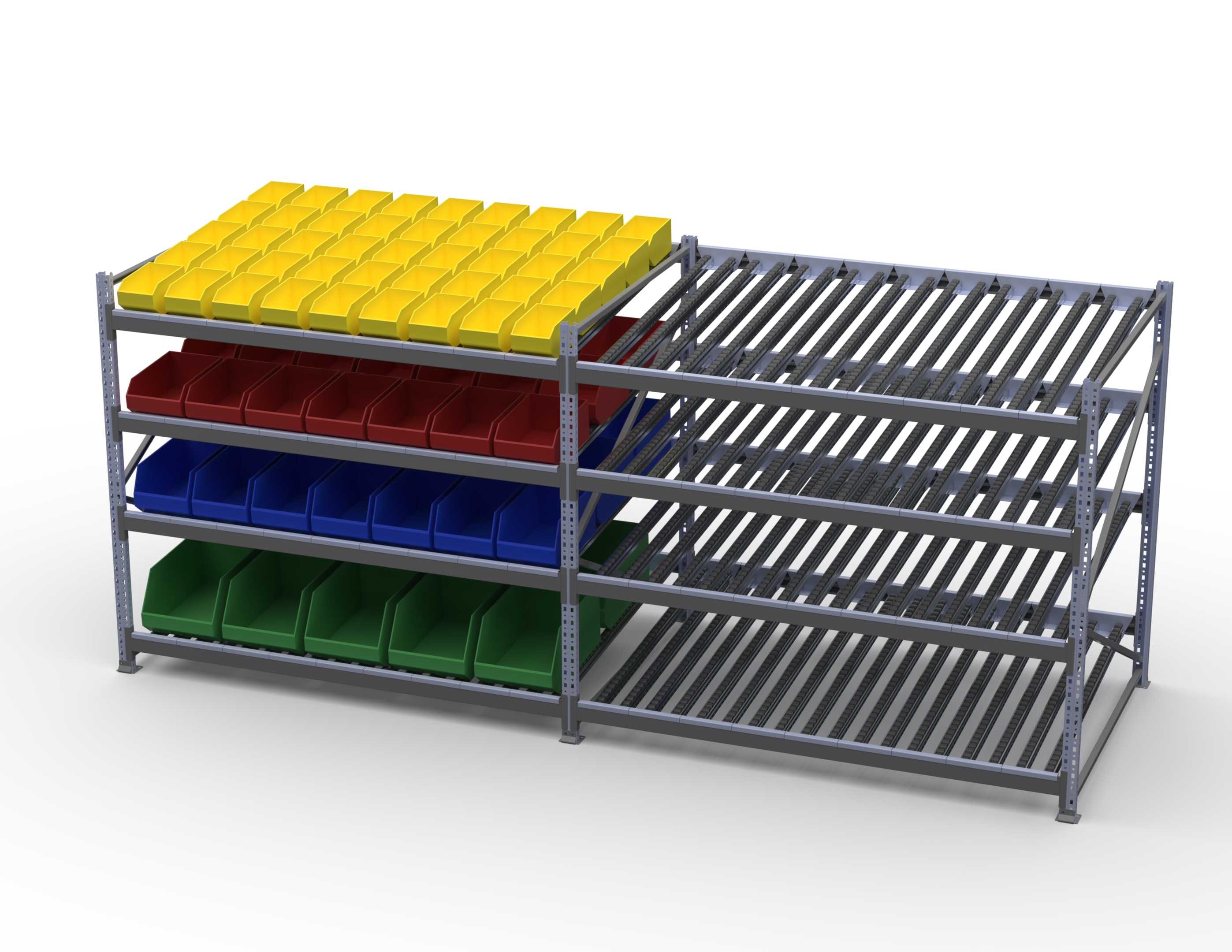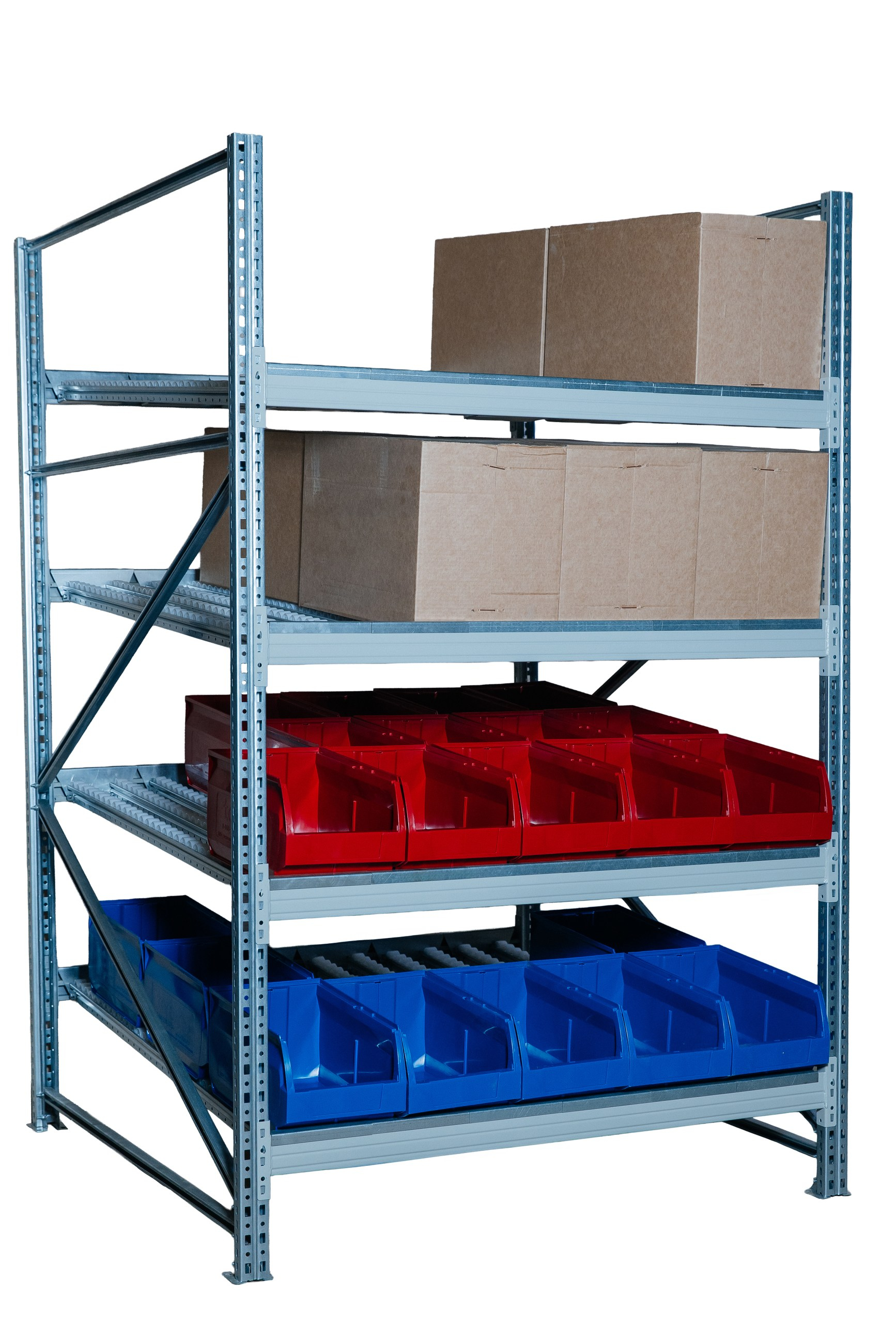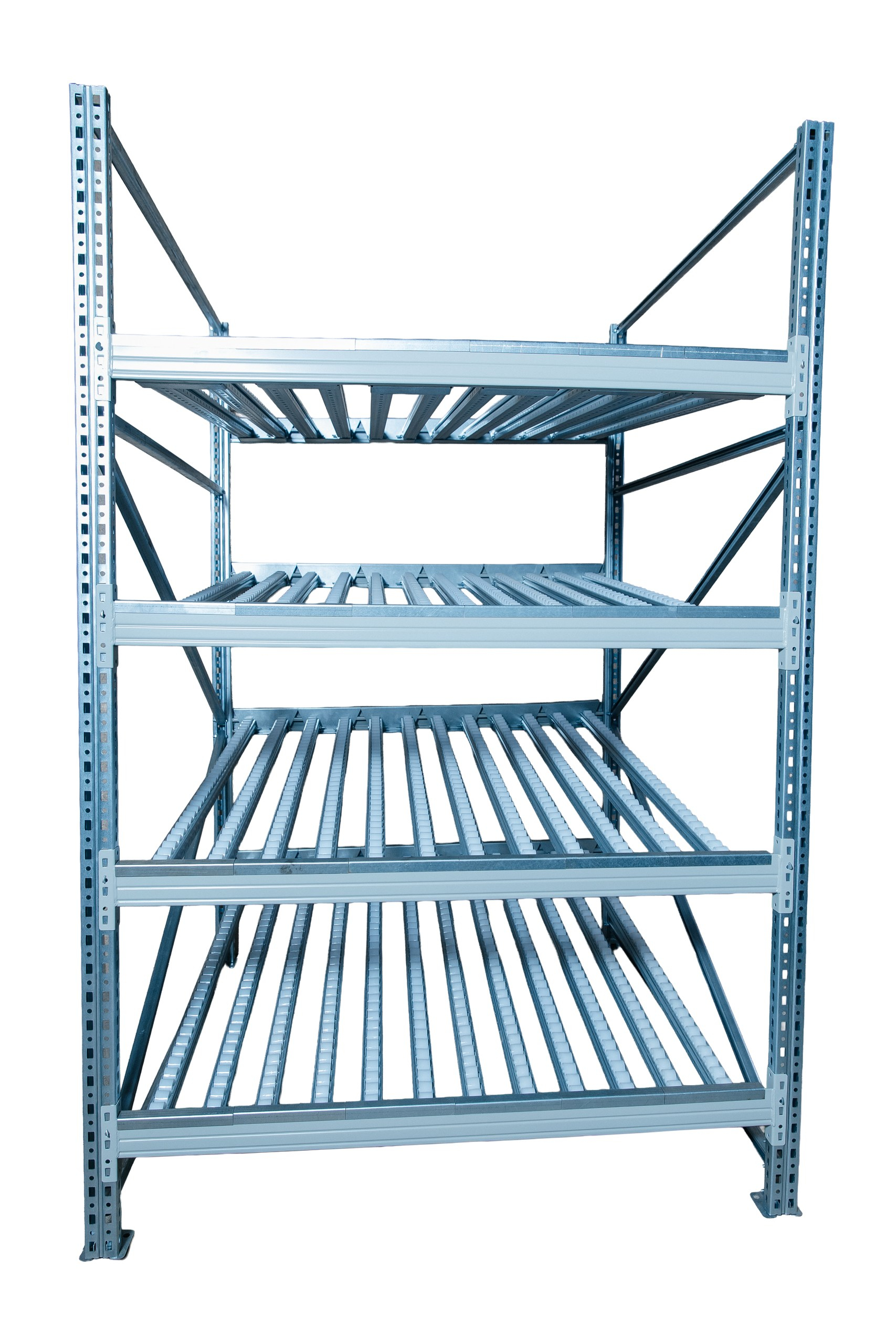 Гравитационный стеллаж с роликовыми полками 1600х1800х1300, 4 яруса