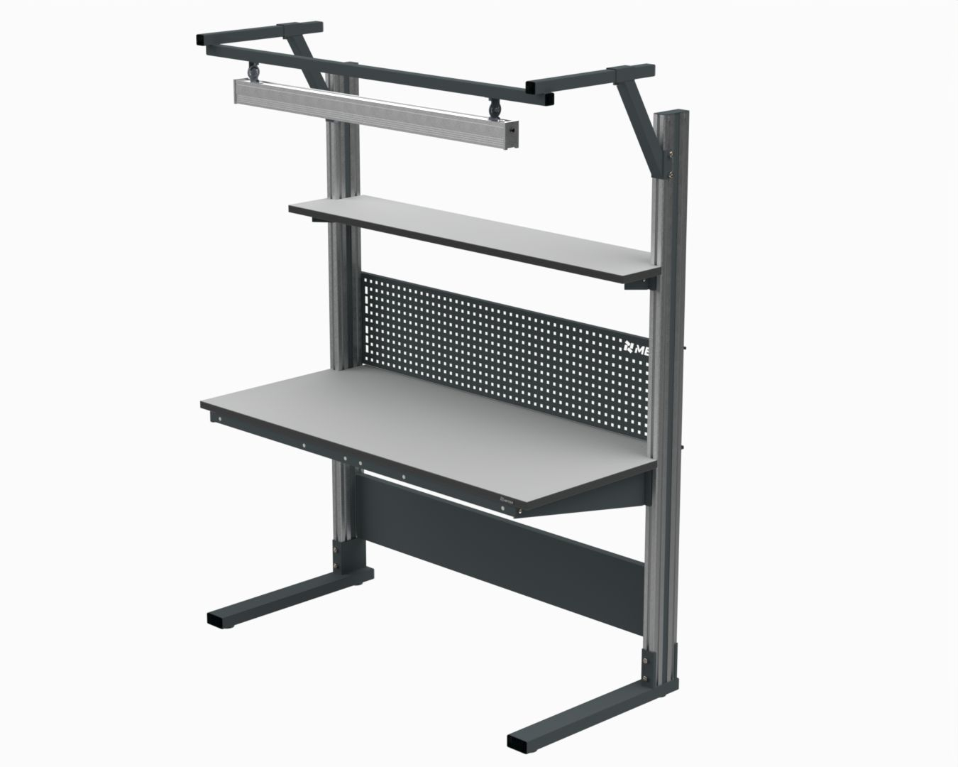 В комплект входят стол из серии "Современный", верхняя полка шириной 300 мм, перфорированный экран, набор для установки освещения и светодиодная лампа.