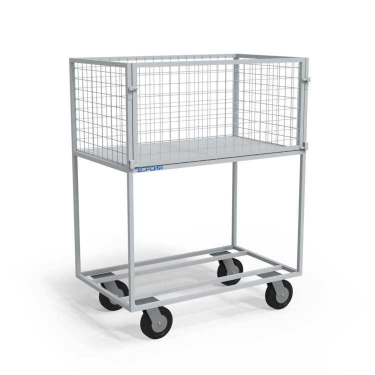 Конструкция включает в себя сплошные сетчатые борта, обеспечивающие свободную циркуляцию воздуха и визуальный контроль содержимого. Один из бортов оснащён откидным механизмом, что значительно упрощает погрузку и выгрузку, особенно при работе с коробками, инструментами, комплектующими или упакованными товарами.