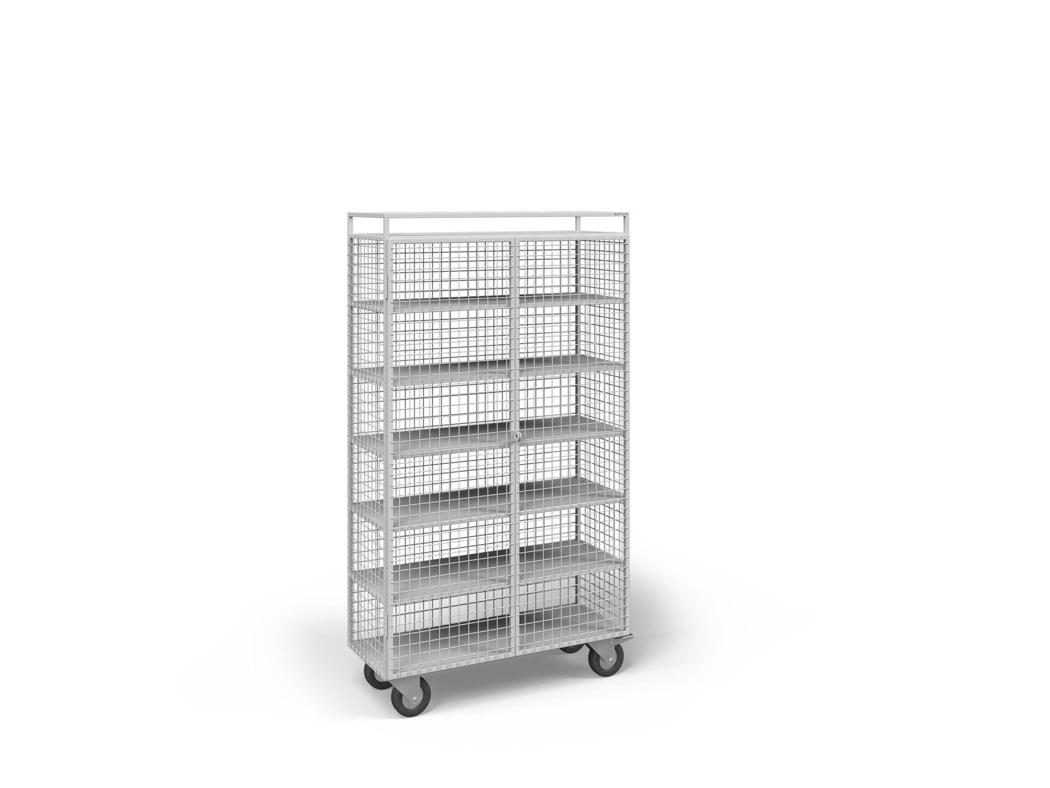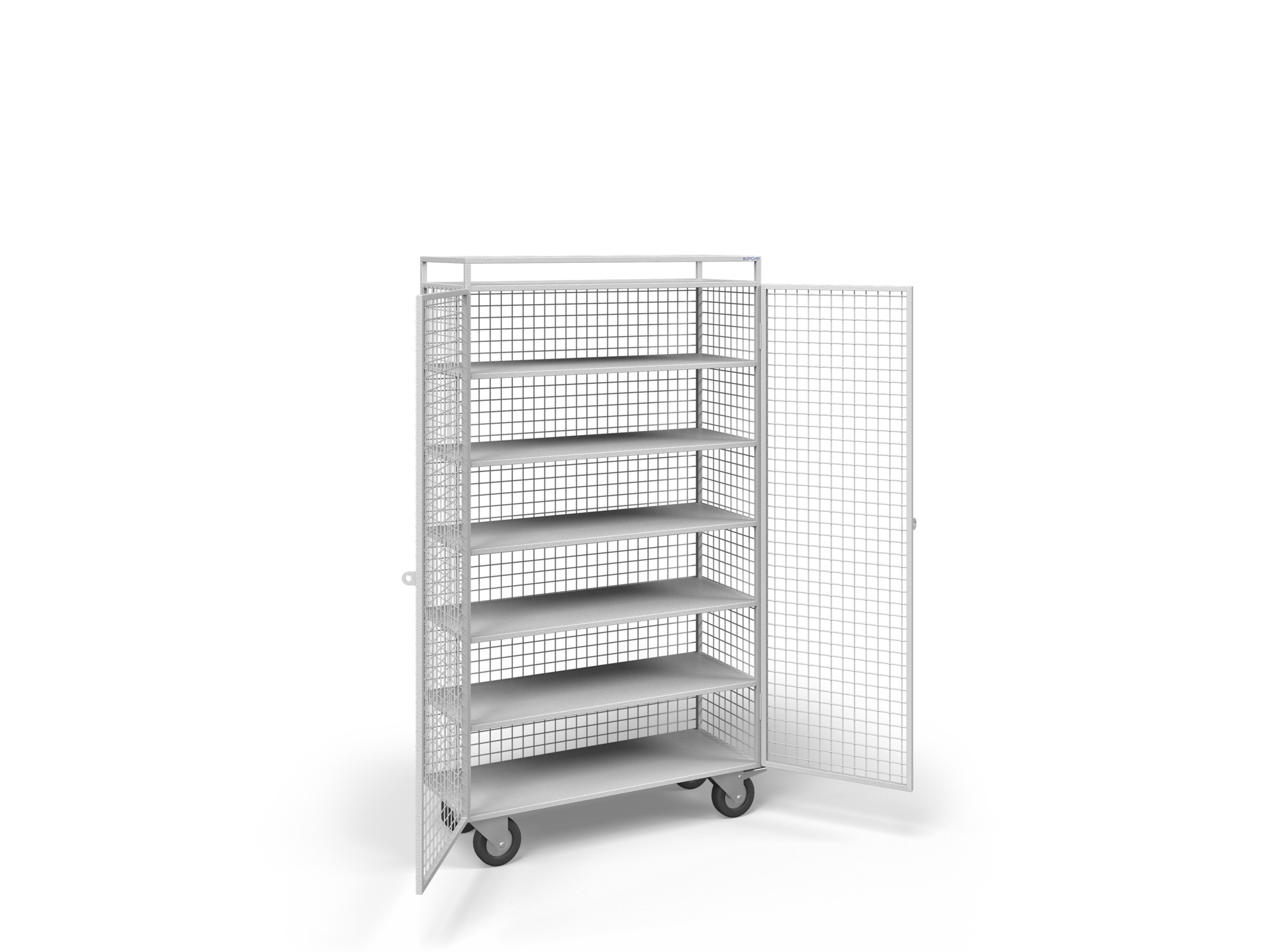 Передвижной закрытый стеллаж-шкаф из металлической сетки предназначен для надёжного и организованного хранения инвентаря, инструментов, спортивного оборудования, складских товаров или производственной продукции. Благодаря прочной конструкции и продуманной компоновке он идеально подходит для использования на предприятиях, складах, в учебных заведениях, спортивных залах и сервисных центрах.