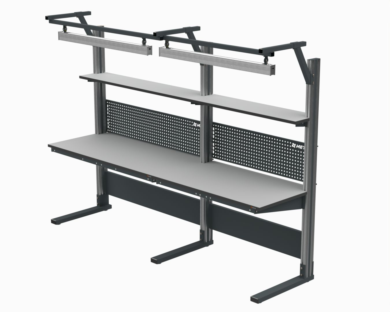 В комплект входят стол серии 41.С, верхняя полка шириной 300 мм, перфорированный экран, комплект для крепления освещения и светодиодная лампа.