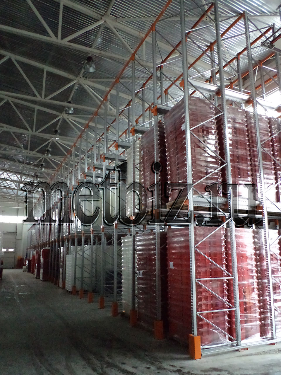 Стеллажи набивные (глубинные) для хранения груза на паллетах. Основная особенность в том, что разгрузка стеллажа идет только в противоположном порядке от последовательности заполнения, и автопогрузчик может двигаться по освобождаемым проходам., т.е. реализован принцип LIFO.